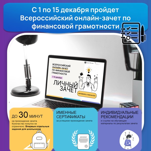 С 1 по 15 декабря можно будет проверить свои знания на Всероссийском онлайн-зачете по финансовой грамотности. Его можно будет пройти самостоятельно или собрать семейную команду и провести время с близкими с пользой.
