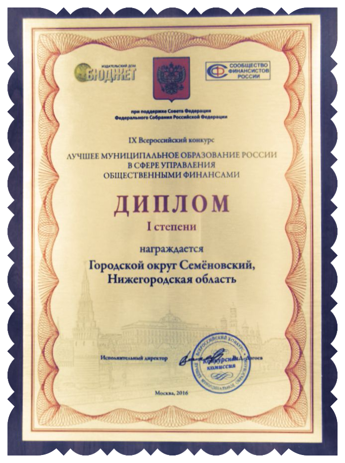 9 июня в Москве состоялась конференция «Бюджетная политика муниципальных образований в современных условиях» на которой были подведены итоги IX Всероссийского конкурса «Лучшее муниципальное образование России в сфере – управление общественными финансами». Городской округ Семеновский признан победителем и награжден Дипломом I степени.